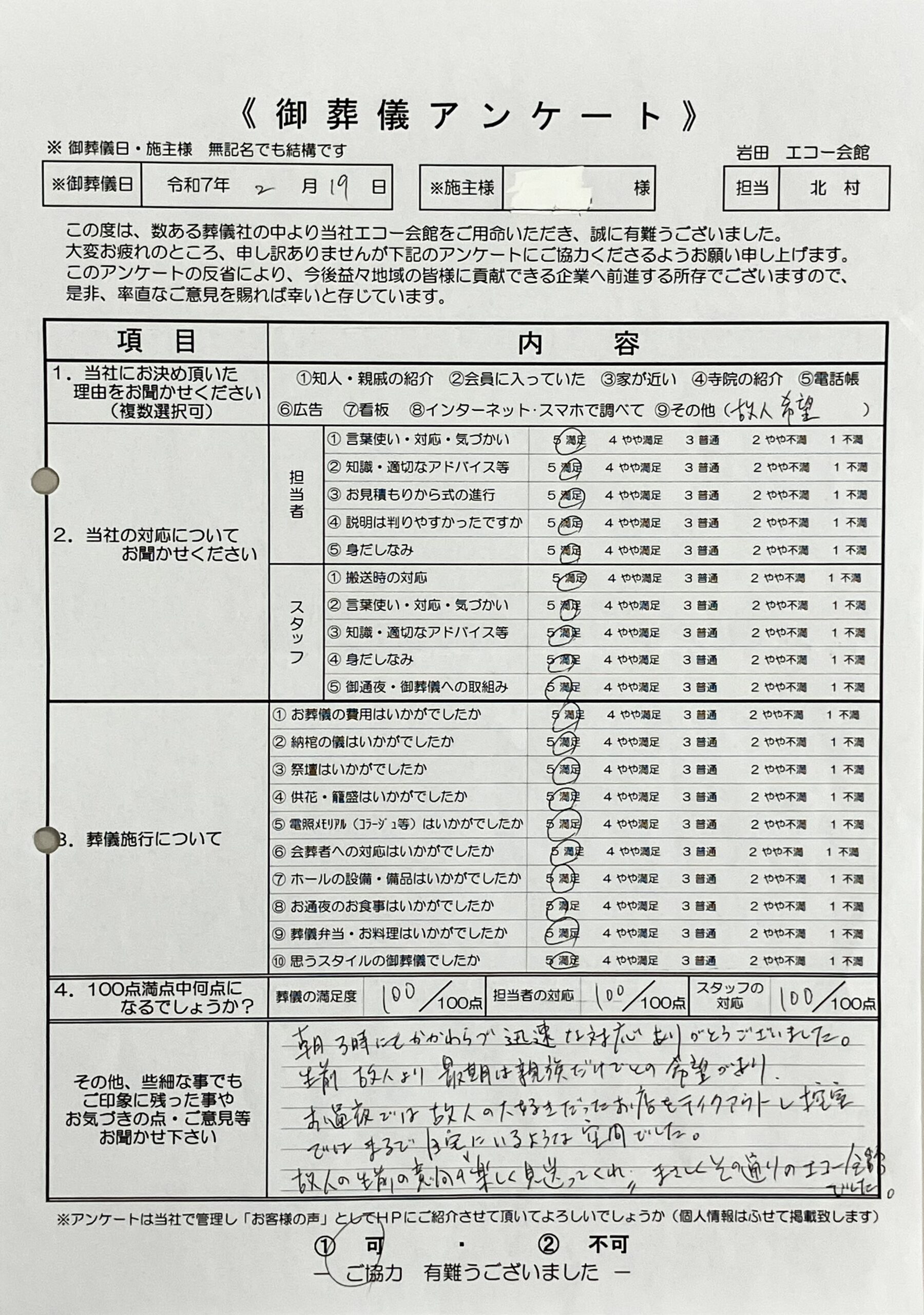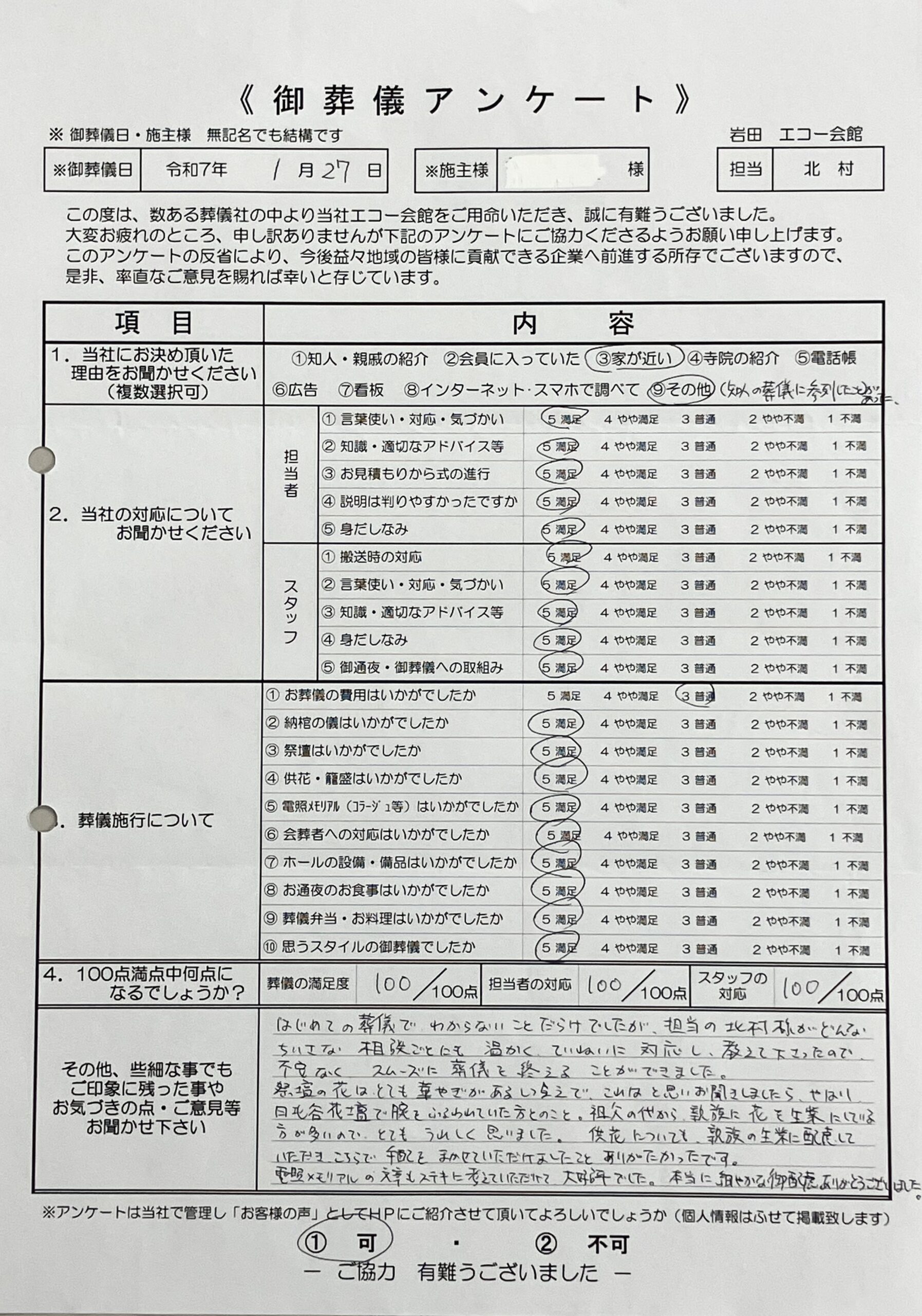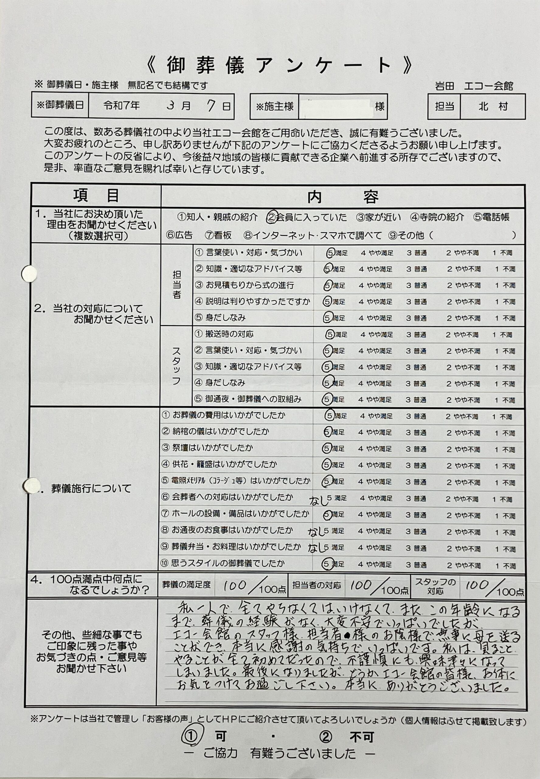 初めてのご葬儀で、ご不安の中、私どもにお任せいただけたこと、心より感謝申し上げます。担当の北村に対する「どんな小さな相談ごとにも温かく、ていねいに対応し、教えて下さった」とのお言葉は、スタッフの大きな励みとなります。お客様のご不安を少しでも取り除き、スムーズにお見送りを終えていただくことこそ、私どもの最も大切にしている使命でございます。ご協力いただき、本当にありがとうございました。