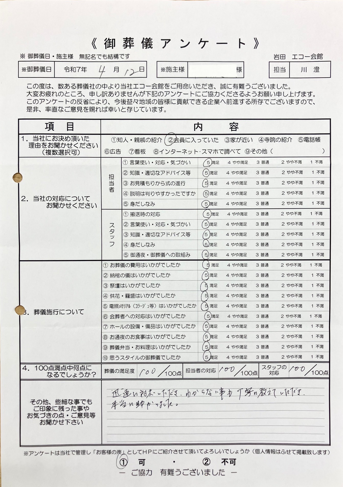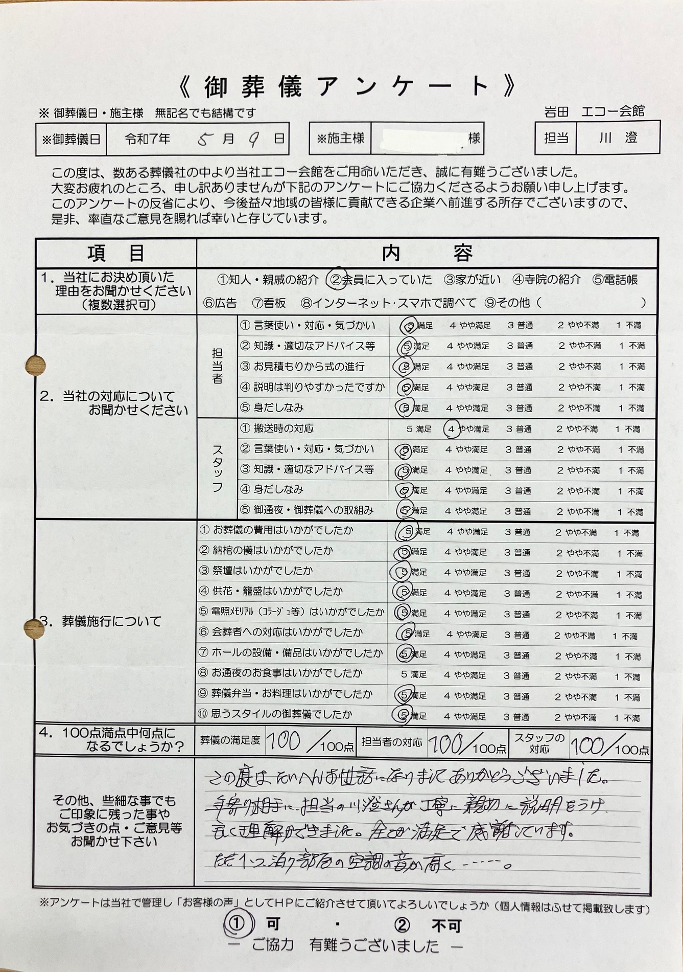 この度はたいへんお世話になりましてありがとうございました。年寄り相手に、担当の川澄さんが丁寧に親切に説明をうけ、良く理解ができました。全てが満足で感謝しています。